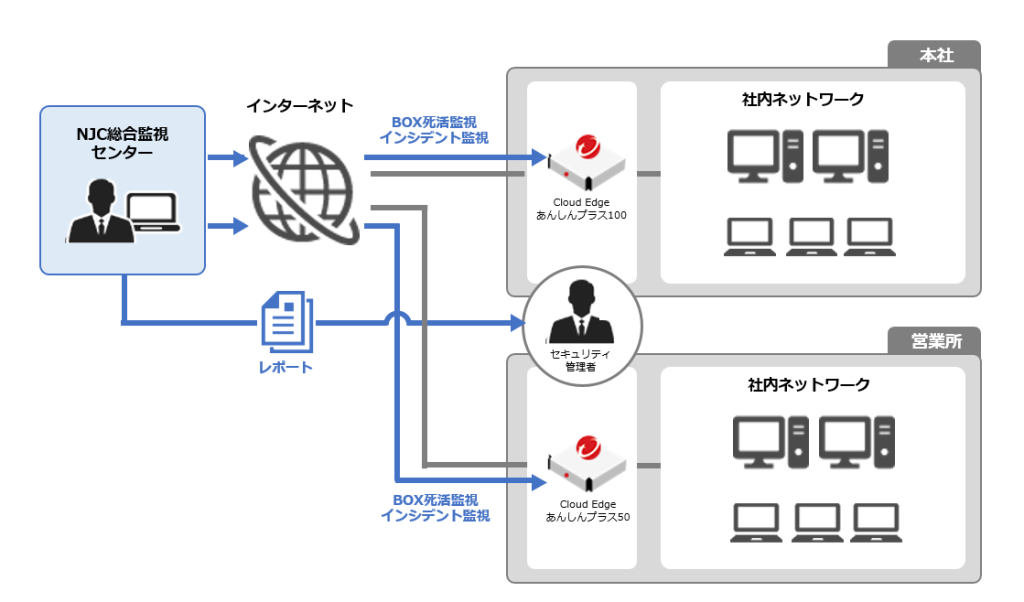 狭山ケーブルテレビ様では、本社と営業所の2拠点に、それぞれ一台ずつ、計2台のセキュリティBOXを設置しています。日本事務器が運営する総合監視センターが、セキュリティBOXの死活監視、インシデント管理を行い、さらに防御状況をレポートで提供しますので、管理者の負担を軽減できます。