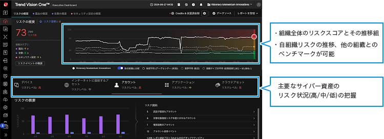 リスク状況のサマリレポートを日々/毎月発行を設定することが可能です。組織全体のリスクスコアや、各資産カテゴリ毎のリスクレベル、要因を確認することができます。